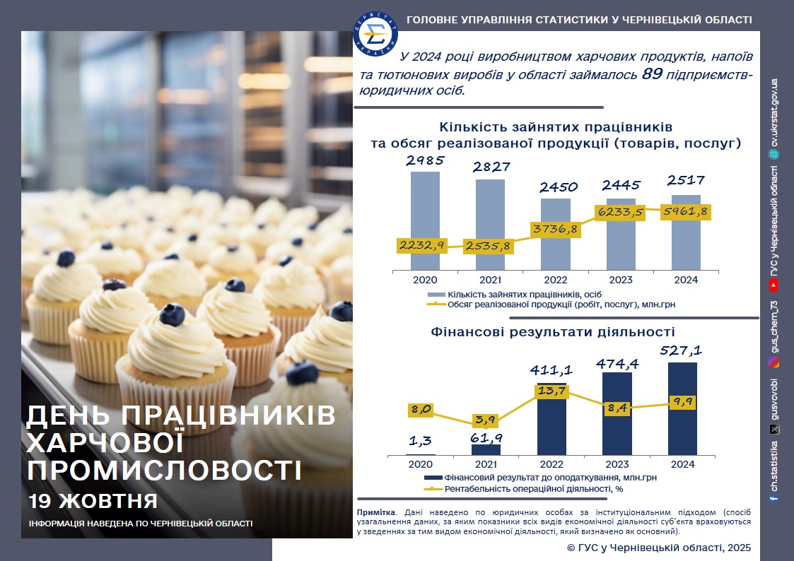 Так, у Чернівецькій області на суб’єкти господарювання з видом економічної діяльності “Виробництво харчових продуктів, напоїв і тютюнових виробів” у 2024 році припадало 28% від обсягу реалізованої продукції (товарів, послуг) у переробній промисловості та 25% зайнятих працівників.