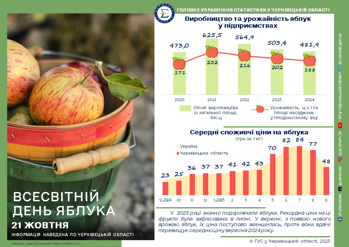 В Україні яблуко здавна шанують і вважають символом достатку та добробуту. А ви знали, що агроформування Чернівецької області, що займаються садівництвом, надають перевагу вирощуванню яблук? Так, у 2024 році під яблуневими садами в підприємствах було зайнято 82% від усієї площі плодово-ягідних насаджень або 2,8 тис.га. Впровадження новітніх технологій інтенсивного садівництва на усіх його етапах — від вирощування фруктів до зберігання врожаю дає змогу отримувати стабільно високі врожаї навіть за складних погодних умов. Буковинські садівники є потужними лідерами з виробництва яблуневої продукції в регіональному розрізі, адже кожне шосте яблуко, вирощене в агроформуваннях України – з Буковини. Вони впевнено завойовують і зовнішні ринки, географія експортних поставок дуже різноманітна. У 2024 році найбільшими імпортерами наших яблук були Об’єднані Арабські Емірати, Швеція, Саудівська Аравія.